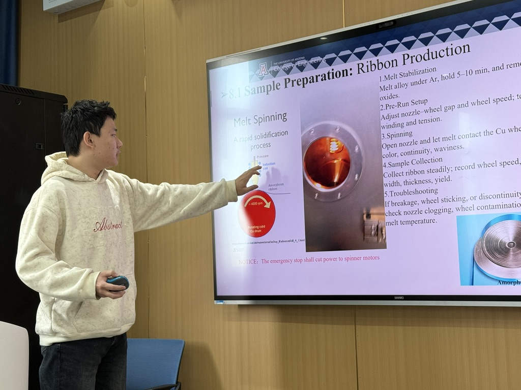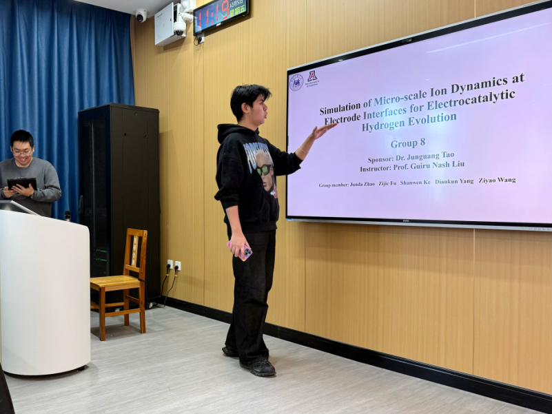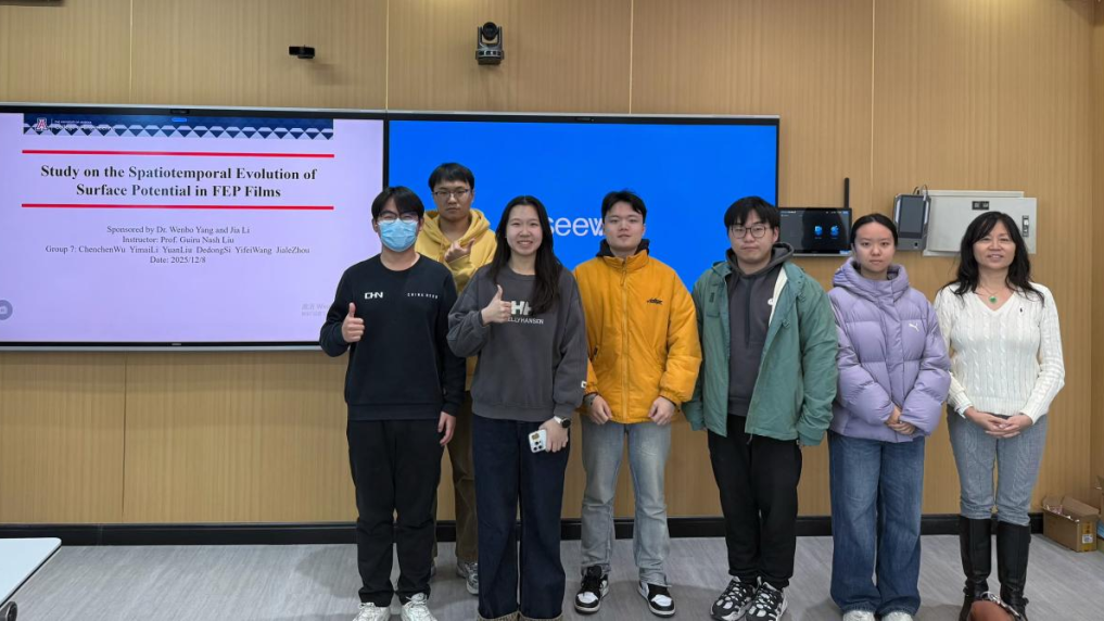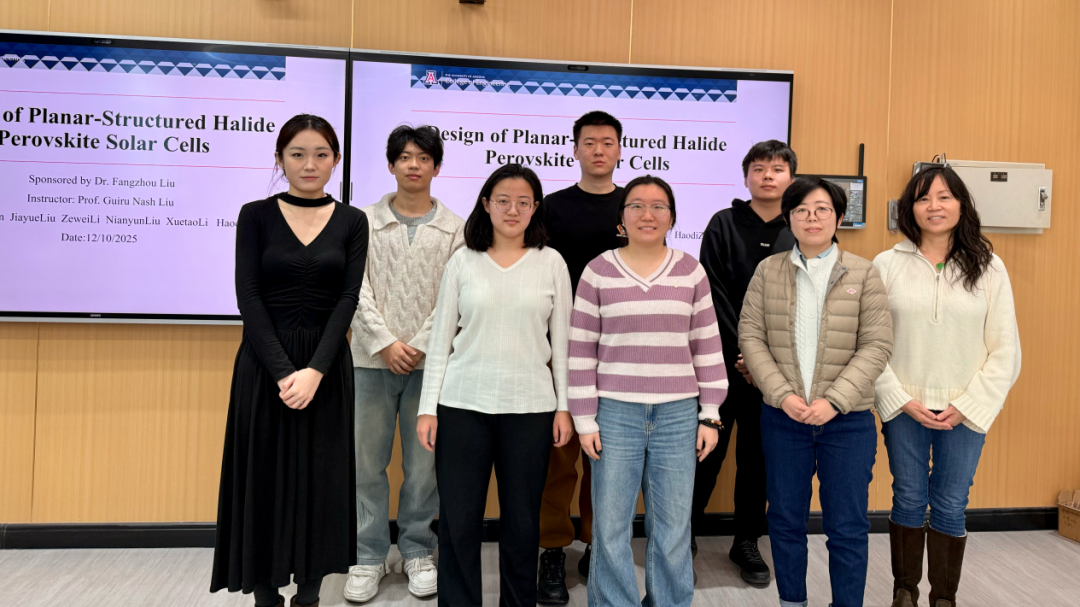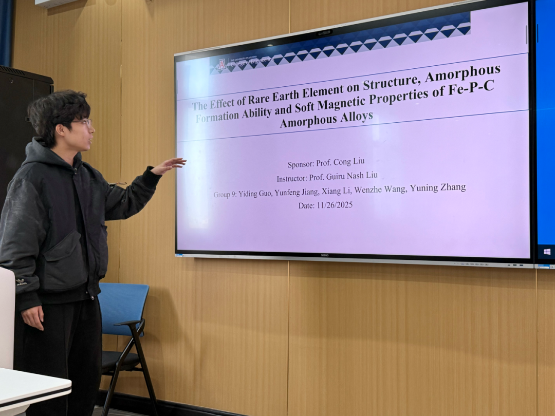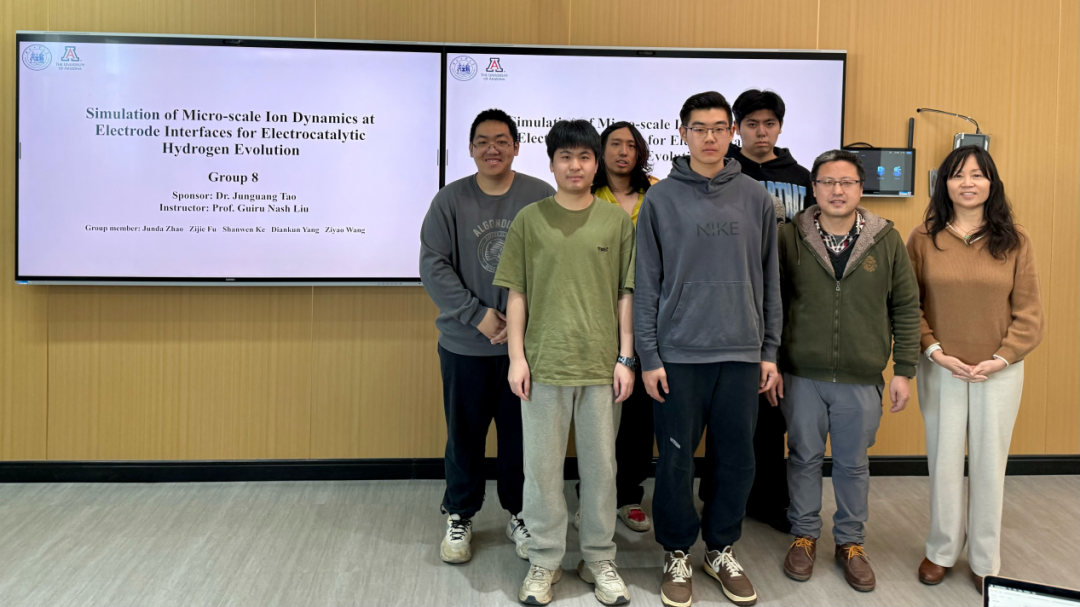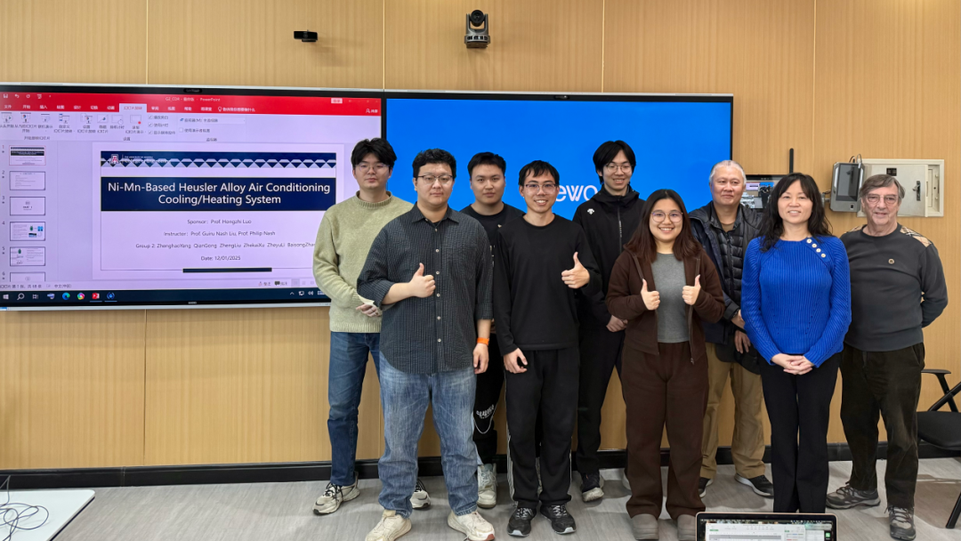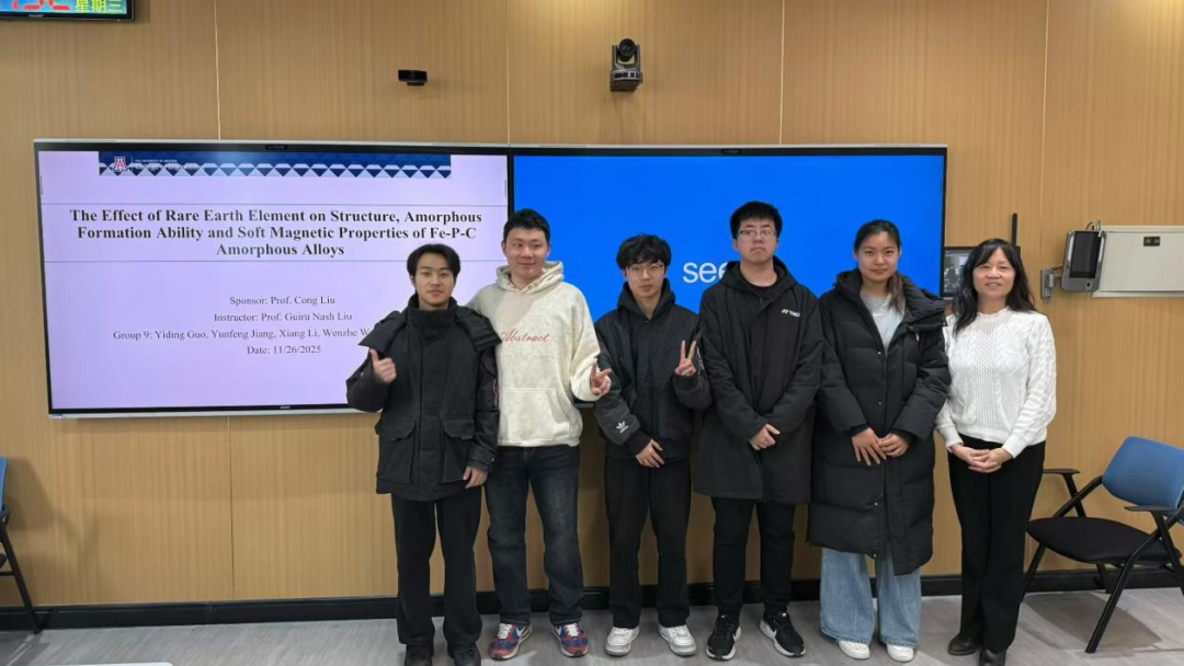 在材料物理专业本次跨学科设计A毕业设计实践中,大象传媒 Guiru Nash Liu教授、Philip Nash教授与罗鸿志、陶俊光、阎文博、李薇薇、刘方舟、刘丛这些校内导师组成国际化-交叉化联合指导矩阵。值得一提的是,10组课题中有9组由导师结合各自学术难题定向抛出,第6组“基于位错密度的忆阻器可靠性预测软件”则由学生自主阅读数篇文献后独立命题——该器件被视为模拟大脑突触的核心元件。其余课题同样锋芒毕露:第2组“镍锰基赫斯勒合金空调制冷/制热系统”成功构建固态制冷原型,正准备申请国家发明专利;第8组“电极界面处电化学析氢的微尺度离子动力学模拟”构建低能耗光电催化体系实现高效水分解制氢,为下一代清洁能源提供新路线;第1组“发展高强度与优异软磁性能Fe-P-C非晶线材大规模连续化生产的工艺”与第9组“研究稀土元素对Fe-P-C非晶合金的结构、非晶形成能力和软磁性能产生的影响”形成非晶合金“工艺—性能”闭环;第3组“钠离子电池中煤基硬碳阳极的研究”为低成本储能提供碳素解决方案;第4组“单光子探测系统”突破极限弱光探测瓶颈;第5组“提高钙钛矿太阳能电池效率的研究”瞄准新一代光伏技术;第7组“探究FEP薄膜表面电位的时空演变规律”揭示介电薄膜电荷演化机制;第10组“基于光伏电荷打印的水性微流体机器人”将光伏电荷打印与微流体操控融合,形成“材料—能量—信息—生命”全链条交叉格局。