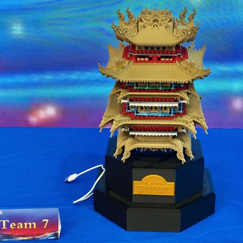 作品以黄鹤楼为原型,经数字建模而成,融合传统榫卯工艺与现代光影艺术。核心目标为实现夜间沉浸式效果,主体内置可遥控RGB彩灯,底座嵌入加湿器借丁达尔效应营造光影烟雾氛围。通过实践,学生系统掌握榫卯核心原理,探索传统建筑数字化转化路径,同时提升了项目统筹与全流程工程实践素养。
