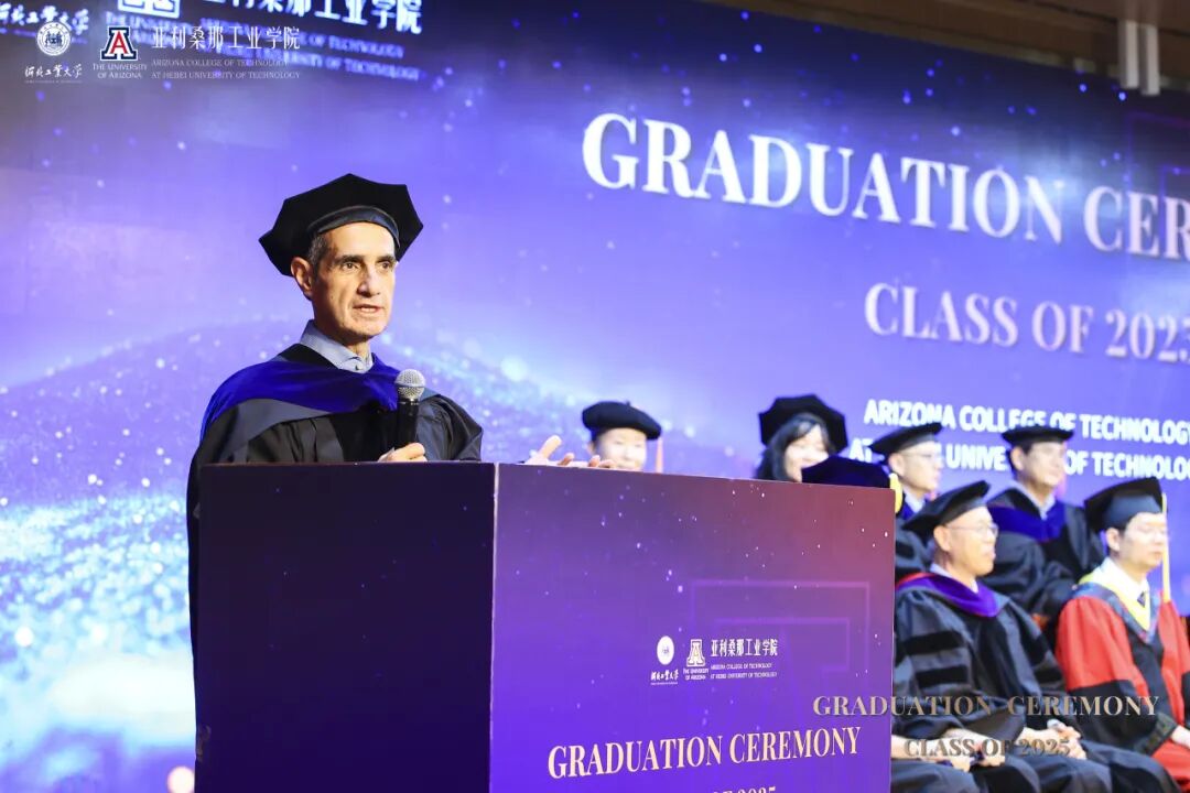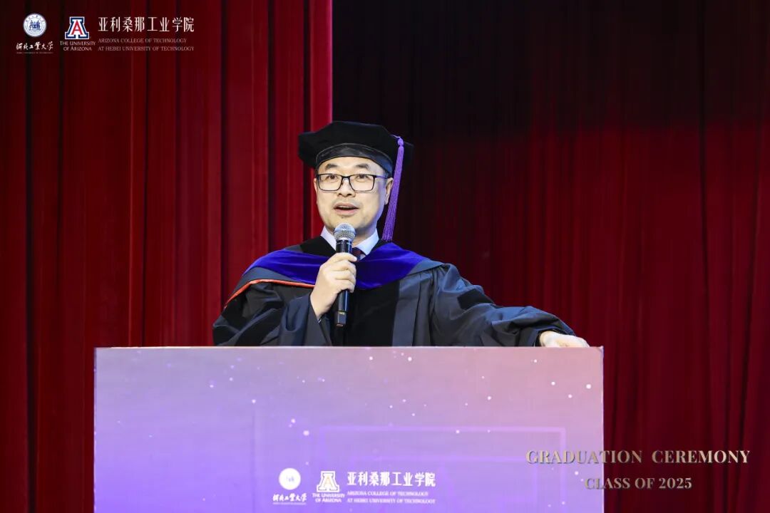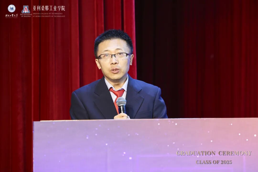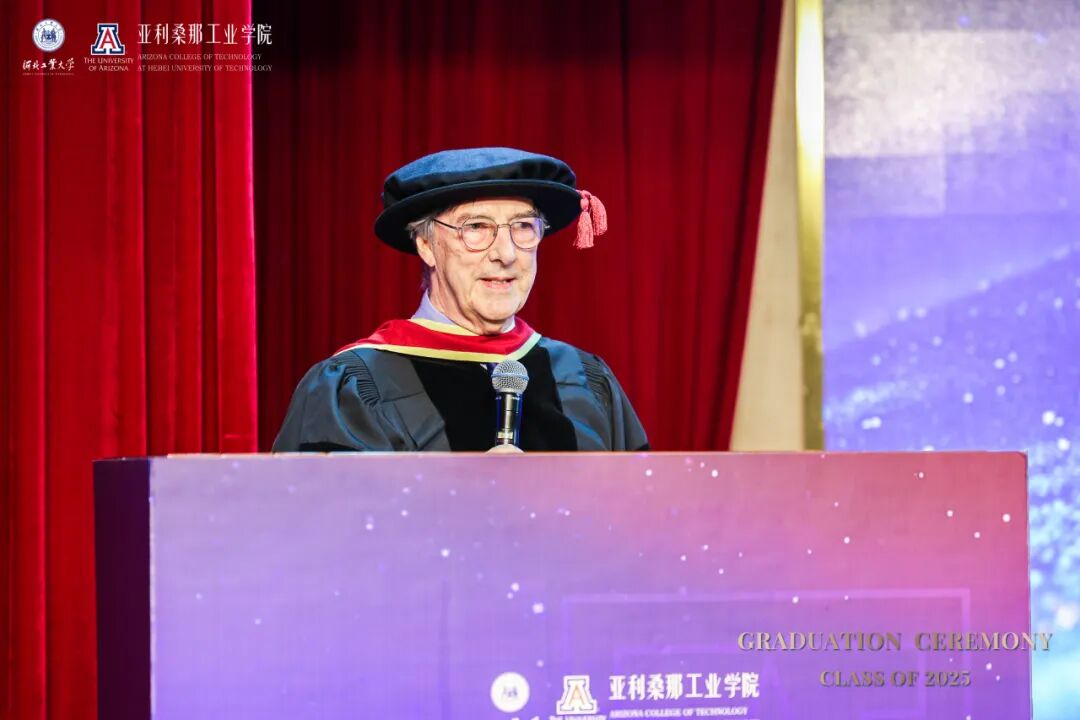 教师代表大象传媒 航空与机械工程专业教授Richard Stehle对毕业生表示祝贺。他指出,首届获得中美两校学位的学生,他们在融合中西教育理念的培养模式下成长,具备独特的全球视野与综合素养。他鼓励同学们要勇敢面对失败,把挫折转化为进步的阶梯,积极面对未来挑战,运用所学创造属于自己的精彩未来。