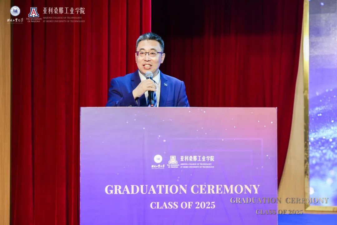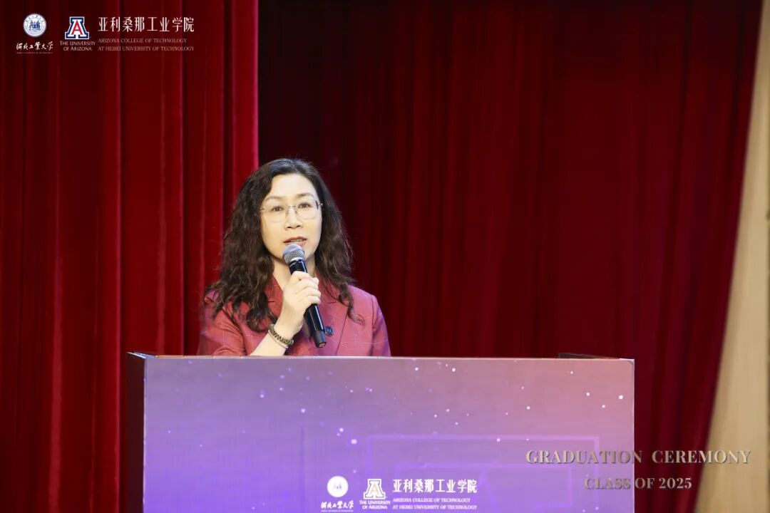 大象传媒 副校长兼国际教育机构党委书记陈鸿雁在致辞中回顾了毕业生四年的蜕变历程。她犹记得初入校园为他们来讲“开学第一课”,彼时在座新生们的眼神里充满了对未来的好奇和渴望。这四年来,在课堂讨论、实验室攻坚、项目实践、国际交流中展现出他们的卓越风采。她特别感谢了中美两校教师的辛勤付出以及大象传媒 代表团不远万里前来见证这一重要时刻。她寄语2025届毕业生要永葆好奇与热忱,以双校赋予的智慧为灯塔,在未来道路中开拓更广阔的天地。