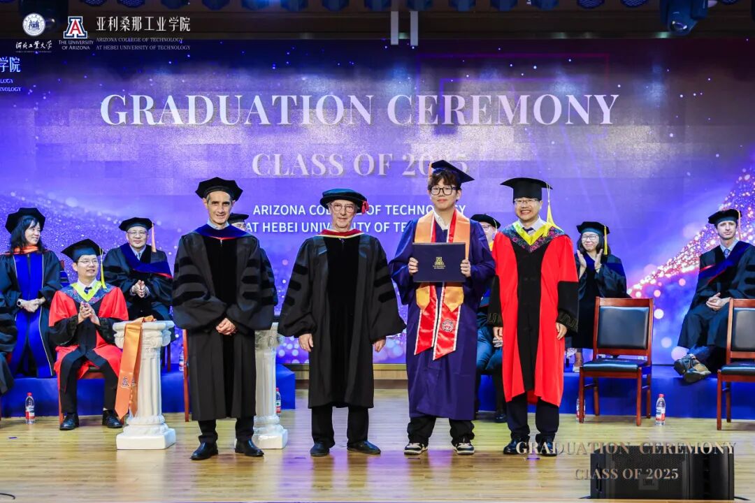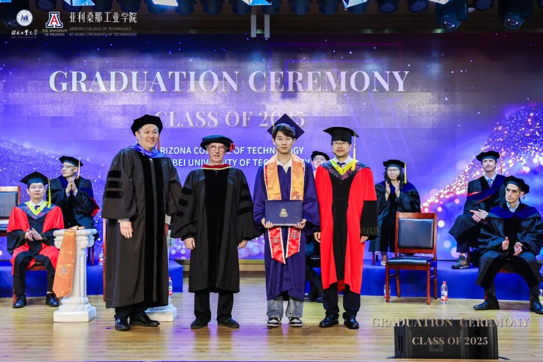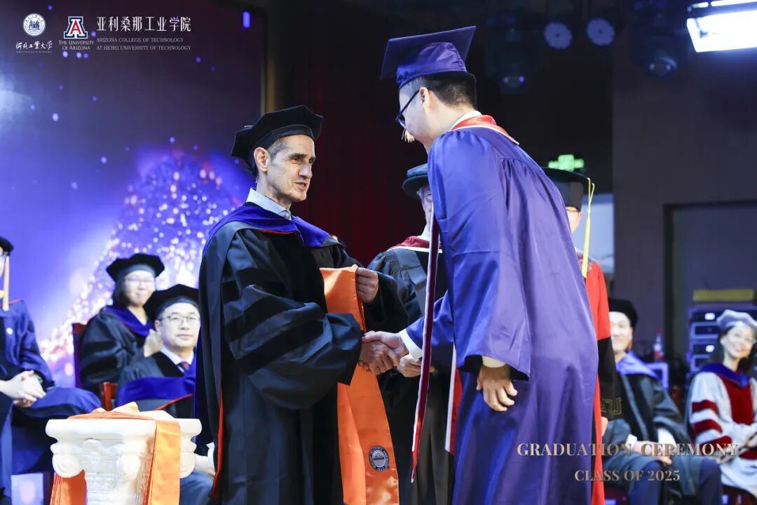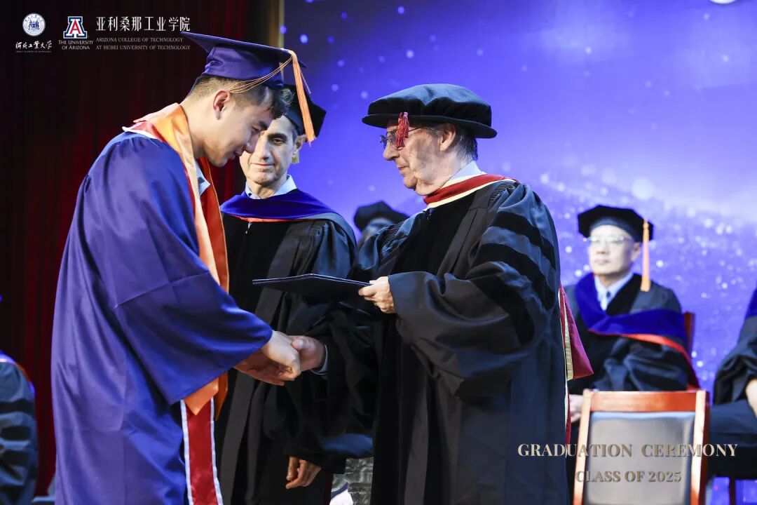在庄严的授位仪式上,Xuejing Wang、Guiru Liu、Fuguang Cao三位教授宣读名单,中方院长卿龙邦、美方院长Philip Nash与各专业系主任为学生颁发学位证,2025届毕业生依次走上舞台,迎来他们人生的重要一刻。
