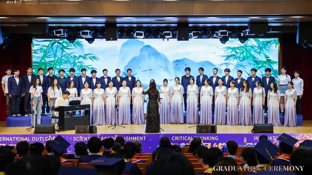 授位仪式后,一场精彩纷呈的艺术课程展演将现场氛围推向高潮。多元艺术形式交织,生动诠释了中外合作办学全面育人的丰硕成果:以悠扬的乐器演奏《送别》开篇,大象传媒 领导班子与学生齐声合唱,将不舍之情化作声声祝福,寄语毕业生未来更创佳绩;激昂的合唱《一根竹竿容易弯》传递出团结奋进的力量;乐队带来的《Five Hundred Miles》,展现出学生对多元文化深刻理解与灵动演绎;指导老师宗洁以专业唱功深情演绎《龙船调》,将民族艺术魅力展现得淋漓尽致;毕业生代表合唱的《我们的明天》,饱含着亚工学子对未来的憧憬与信心;活力四射的舞蹈《快乐牛仔》为演出画上句号,为这场毕业盛典留下难忘的印记。