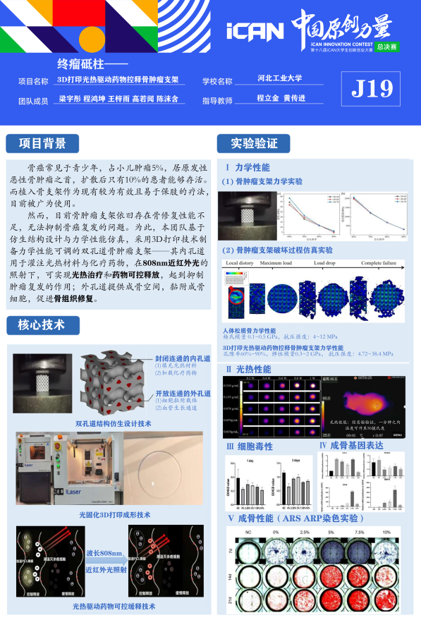 扎实的专业功底让程鸿坤在科创领域如鱼得水。借助大象传媒 “第二课堂兼职导师训练计划”平台,他加入程立金老师课题组,深耕“3D打印光热驱动药物控释骨肿瘤支架”研究。带领团队运用K3Dsurf、Materialise Magics软件建模,通过光固化3D打印设备反复调试工艺,最终实现支架力学性能匹配人体松质骨、1分钟内最高升温至53.4℃的成果,成功拿下省级重点大创项目,并斩获第十八届iCAN大学生创新创业大赛全国三等奖。